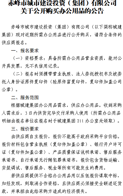 赤峰市城市建設(shè)投資(集團(tuán))有限公司 關(guān)于公開購買辦公用品的公告